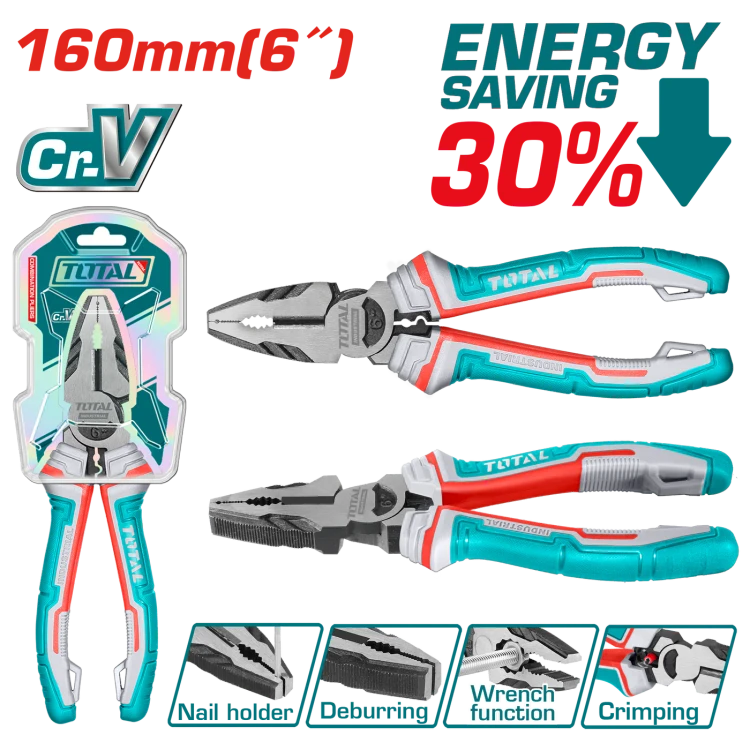 انبردست توتال فوق صنعتی 6 اینچ مدل THT210606S یک ابزار پیشرفته و چندکاره برای مصارف صنعتی و حرفهای است. این انبردست با طول 160 میلیمتر و ساختهشده از فولاد کروم-وانادیوم (Cr-V)، دوام و مقاومت بسیار بالایی دارد.